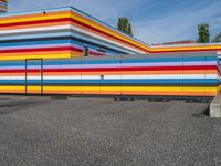 an empty parking lot painted brightly stripes on the wall of the building and sky as well as stones