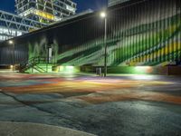 This stock photo showcases a night view of modern architecture in Berlin, Germany. The city is known for its impressive buildings and unique urban design. The image features a well-lit road with a modern building facade, creating an interesting line of light against the dark night sky. The courtyard in front of the building is adorned with vibrant graffiti art, adding an urban touch to the metropolitan area. The clear sky and artificial lights create a captivating scene. This photo perfectly captures the dynamic city life and artistic atmosphere of Berlin's art district, with its creative graffiti walls and intriguing warehouse galleries hidden in the Hinterhof.