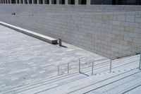 Elevated view of urban Berlin. Modern architecture blends with the city's historic brickwork. Grey paver surface leads to an open space, with a gallery showcasing contemporary art. A high-slope stair enhances the urban design.