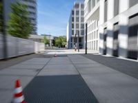 A view of a straight road in Berlin, Germany, lined with modern architecture office buildings. The motion blur of passing traffic adds to the urban vibe. Clear sky and hard shadows create a visually striking scene in this bustling business district.