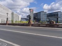 This is an image of a modern cityscape in Berlin, Germany. The photo captures the iconic architecture, including high-rise buildings, skyscrapers, and bridges. The city's urban design is evident with the well-maintained roads and street lights. Vegetation adds a touch of green to the scene. The clear sky provides a beautiful backdrop to the city. This image represents the perfect blend of classic and modern architecture in Europe's vibrant capital city.