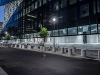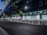 Modern office buildings in Berlin's financial district, illuminated by street lights at night. The empty city street lined with steel cylinders adds a touch of urban design. A glimpse into the bustling city life of Europe's business hub.