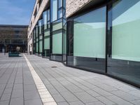 an empty sidewalk next to the glassed buildings in the city with people walking around