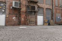 a man sits on a skateboard in front of an old brick building with several doors
