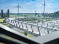 This stock photo features a modern architecture bridge in Germany. The bridge is made of composite materials and is elevated, allowing for a clear view of the surrounding landscape. The road surface is made of asphalt and a fence with a mesh design runs along the thoroughfare. Towering transmission and power poles are seen in the foreground, with an overhead power line connecting them. The urban design of the area is well-maintained, with lush vegetation and trees adding to the scenic view. The clear sky and clouds above add to the overall atmosphere. This image can be used to convey concepts related to infrastructure, urban development, and modern architecture in Germany and Europe.