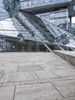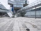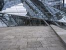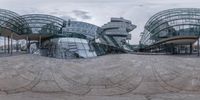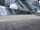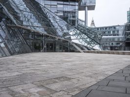 A modern architectural marvel in Hannover, Germany. The building's monochromatic facade and glass sculpture stand out against the grey sky. The open space and walkway add to the urban design of the business district.