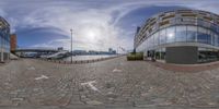 A modern architecture building on the edge of a road in Holland. The fisheye lens photograph captures the surrounding buildings and the clear sky. The urban design and business district create a dynamic cityscape in Europe.