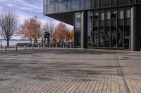 This image captures the modern architecture and urban landscape of downtown Toronto, Canada. The city showcases a mix of office buildings, open spaces, and public plazas. The reflection of the buildings on the glass facades adds an interesting visual element. The photo was taken during the autumn season, giving the trees a vibrant display of colors. The clear sky and cloud formations provide a backdrop to the cityscape. In the foreground, a road surface leads to a pier and harbor, highlighting the connection between the city and water. This photo represents the bustling business district of Toronto.