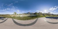 A modern residential area in California with a grassy field and houses. People enjoy skateboarding on the cement pavement while surrounded by beautiful mountain views. The open space and clear sky create a serene and inviting atmosphere.