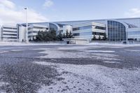 This stock photo showcases a modern architecture building in Canada's urban design. The building's facade is made of metal and concrete, with sleek lines and reflections that give it a contemporary look. The city can be seen in the background, with roads, water, and infrastructure. The image captures the essence of a thriving business district with corporate headquarters and office buildings. The open space and mixed-use areas create a balanced and inviting atmosphere. The snowy winter landscape adds a touch of serenity to the bustling cityscape.