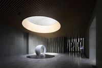 a view into a large circular open space with lights above the circular hole and white vase on the concrete floor