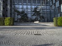 This stock photo showcases the beauty of modern architecture in the bustling city of Berlin, Germany. The image captures a paved street between two buildings, with a stunning building featuring a glass roof adorned with plants on each floor. The architectural design perfectly blends with the surrounding urban landscape, showcasing the city's vibrant and thriving business district. This image is perfect for illustrating concepts related to architecture, urban design, business, and city life in Europe.