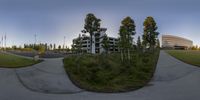 A modern architectural masterpiece in the heart of a bustling city. The building stands at an angle, creating a unique perspective of the surrounding streets. The vibrant green grass adds a touch of nature to the urban landscape.