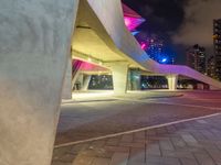 A futuristic cityscape at night with modern architectural structures and neon lights. The city is alive with the glow of artificial lighting, showcasing the vibrant city life. The urban design features a plaza, underpass, road surfaces, and a parking lot.