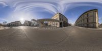 a spherical image is taken from the street of an industrial city, showing a half - way view and two large buildings