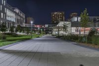 This photo captures the urban landscape of Toronto, Canada at night. The modern architecture of the office building is illuminated by artificial street lights, creating a stunning contrast against the dark sky. The straight road and sidewalk are lined with vegetation and grass, illuminated by light fixtures. This image showcases the vibrant cityscape and urban design of Toronto's business district at night.