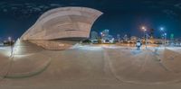 A modern architecture business district in Dallas, Texas. The elevated road leads straight to the city skyline. The low-lit skateboard park contrasts with the bright artificial lights of office buildings. A dark, urban cityscape.