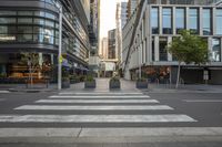A bustling city street lined with modern architecture and tall skyscrapers. The empty road leads to a vibrant shopping center, with a crosswalk indicating pedestrian activity. Urban design and business district vibes make it perfect to eat out and enjoy city life.