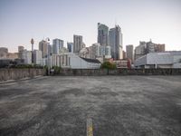 a parking lot is empty in front of some tall buildings on a sunny day in the city