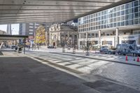 This image captures the modern architecture and bustling city life of Toronto, Canada. The photo shows a vibrant city street with buildings of various designs and sizes. The mixed-use buildings stand tall against the clear sky, reflecting the urban design and infrastructure of the metropolitan area. Pedestrians walk on the sidewalk, while cars, buses, and orange cones indicate the busy nature of the city. In the distance, the iconic Toronto City Hall and a music hall can be seen. This image represents the dynamic business district and public spaces in the heart of Toronto.