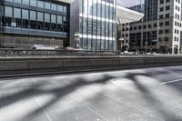 A monochrome view of Chicago's urban cityscape. Modern architecture and office buildings line the concrete streets. The reflection of the buildings and Armco barriers create a striking urban design. Experience the vibrant metropolitan area of Chicago.