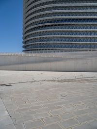 A modern architectural marvel in Zaragoza, Spain. The clear sky serves as a stunning backdrop to the concrete walls and pavers. An open space venue perfect for events and gatherings in the heart of Europe.