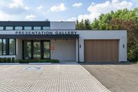 A modern architecture gallery in Toronto, Canada. The driveway is lined with pavement running through a parking lot. The business district features office buildings and residential villas.