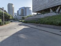 a paved, empty city street with grass along the sides and modern architecture on the hill