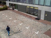 This is an image of a modern architecture office building in the business district of Holland, Netherlands. The building stands tall against the grey sky, with windows reflecting the open space and surrounding urban design. The road surface is made of asphalt and cobble stone, bordered by brick curbs. The vegetation adds a touch of green to the urban landscape. The photo captures the vibrant city life and the infrastructure of Holland. It represents the combination of business and architecture in this European city.