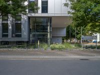 a large building with an entrance on a city street lined by tall green trees, and a small bench near it