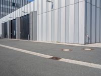 This is an image of a modern industrial building in Bremen, Germany. The grey facade and rectangular shape of the building give it a contemporary and urban design. The building is situated along a road surface made of asphalt, with a clear sky overhead. On either side of the walkway, there are two drainage covers. This photo represents the modern architecture and industrial landscape of Bremen, and showcases the loading dock and composite materials used in the construction of the building.