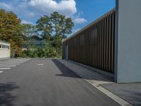 a metal building with a corrugated door in front of it and trees lining the street behind it