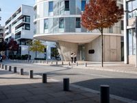 Modern architecture in Hamburg, Germany. A person stands outside the building on a street surrounded by urban art. A passerby adds movement to the scene in this vibrant European city.