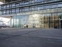 This is an image of a modern architecture building in Hamburg, Germany. The building features a unique facade with windows of various shapes, providing a panoramic view of the city. The glass walls reflect the surrounding metropolitan area, creating a stunning visual effect. This is a mixed-use property that serves as both residential and office space, making it a vibrant and bustling place. In the foreground, there is a road surface made of asphalt, and beyond that, an open space with corporate headquarters and apartment buildings. This photo captures the essence of the business district in Hamburg.