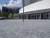 This stock photo showcases a stunning example of modern architecture in Berlin, Germany. The image features a large building with a lot of glass windows, making it a striking sight against the clear sky. The sun shining on the facade adds a beautiful touch to the scene. With its sleek design and open space, this building serves as a corporate headquarters and a tourist attraction in the metropolitan area. The cobblestone road surface and urban surroundings further enhance the urban design of this architectural marvel. Whether viewed as an office building, headquarters, or a convention center, it is a true testament to the innovative architectural abilities seen throughout Europe.