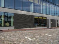 A modern office building in the heart of Holland's business district. The yellow frisbee on the pavement adds a touch of playfulness to the urban design. The glass window reflects the vibrant city life.