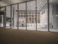 the inside of a glass walled room with lots of glass doors and shelves that are white