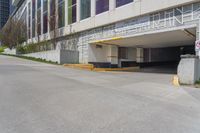 This photo showcases urban architecture in Toronto, Ontario, Canada. A modern residential building stands tall next to an empty parking garage and a road. The clear daytime sky provides a vibrant backdrop to the scene. The urban design of the building's facade and the asphalt road surface create a harmonious composition. This picture represents the city life and modern architecture of Toronto.