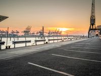 a manhole in a parking lot near the water at dusk with a cargo ship out of sight