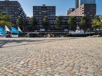 This is an image of a modern cityscape in Holland, Netherlands. The photo showcases a blend of classic and modern architecture, with high-rise buildings and traditional houses lining the cobblestone and asphalt roads. The open spaces are filled with trees and vegetation, creating a natural and urban mix. In the distance, a clear sky overlooks a lake and industrial factories. This image captures the essence of urban design and infrastructure in Europe. It represents the harmonious coexistence of classic and modern elements in the Netherlands.