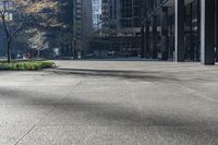 A sunny day in Toronto's business district. Modern architecture dominates the cityscape, with high-rise condominium buildings and office buildings lining the streets. Open spaces and plazas provide public spaces for city life. The city's urban design is highlighted by the concrete roads and tar surfaces.