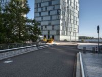 A vibrant cityscape in Holland, showcasing modern architecture and high-rise buildings. Clear skies highlight the urban design of the residential area. Roads and overpass intersect, lined with trees and plants.
