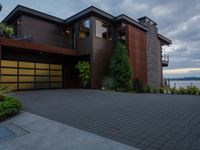 A modern residential villa at dawn. The grey sky casts a gloomy shade on the house, highlighting its sleek and modern architecture. The asphalt road surface leads to the property, surrounded by lush vegetation.