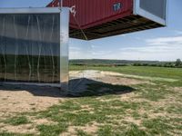 This is an image of a rural landscape in Germany, showcasing modern architecture and open green fields. The clear sky allows for a reflection of a sculpture hanging upside down outside a house. The lush grass surface adds to the serene and natural atmosphere of the scene. This photo represents the beauty of European architecture blending harmoniously with the surrounding nature. Explore the combination of art, agriculture, and open space in this captivating image.