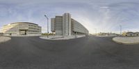 A panoramic view of an empty street in Lisbon, Portugal, surrounded by modern architecture. The cloudy blue sky adds a touch of drama to the scene. The urban design and symmetrical buildings create a visually stunning composition.