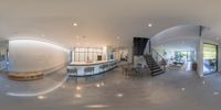 Modern architecture meets nature in this spacious Los Angeles villa. The interior design showcases a yellow-themed living room, with a spiral staircase as the centerpiece. The kitchen and dining area provide a perfect space for recreation and relaxation.