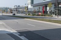 An empty city street in Toronto, Ontario with modern architecture and mixed-use buildings. Clear sky reflects on the polished asphalt road surface. A vibrant urban neighborhood for business, shopping, and city life.