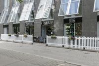 This photo showcases modern architecture and city life in Toronto, Canada. The image features a mixed-use property with a beautiful facade. In front of the property, there is a picket fence on the sidewalk. The open window store invites customers to come in and explore. The urban design and iron fence add character to the scene. The busy urban atmosphere is evident with the presence of office buildings, shop fronts, and restaurants. This photo captures the essence of city living and the diverse range of activities it offers.