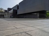 the large building has several black walls in it and a dog laying on the ground outside