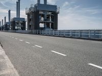 A modern architectural cityscape in Holland, featuring a coastal road with clear skies above. The landscape is dotted with industrial infrastructure including factories, power stations, and chimneys. The road is busy with bicycles and cars.